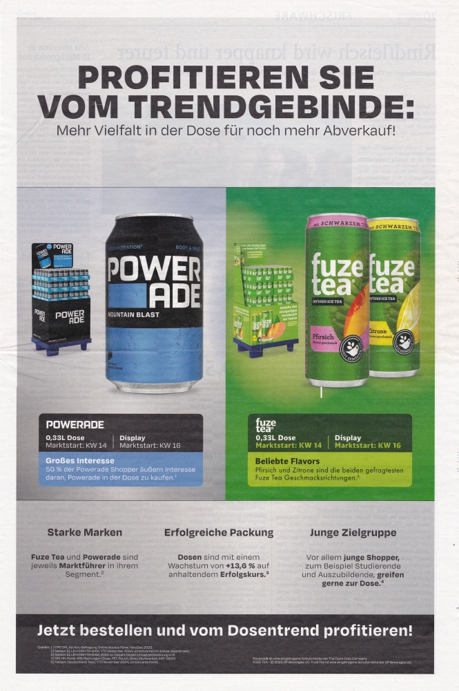| Ganzseitige Anzeige. Abgebildet wurden Musterdosen, alle ohne "Eine Auswahl attraktiver Vereine" und mit schmaler Trinköffnung. |