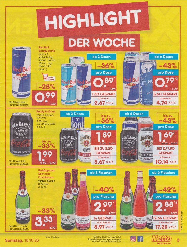 | 6 Dosen für 3,99 €. Anmerkung: Statt eines Sixpacks wurden hier Einzeldosen abgebildet, obwohl Netto über entsprechende, wenn auch veraltete, Grafiken verfügt. | ||||||