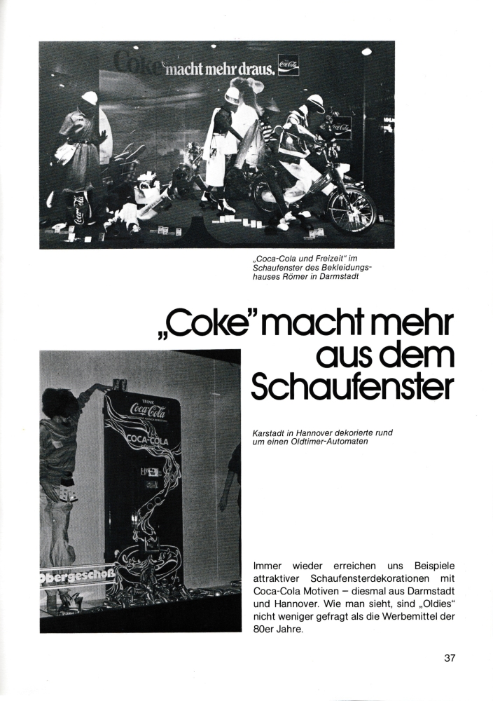 Schaufensterdekoration mit Coca-Cola Dosen im "Spielwarengeschäft Obletter" in München. |
